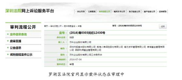 2016年,万科工会以钜盛华、前海人寿,以及宝能系增持资金所涉及的资管计划通道方南方资本、泰信基金、西部利德五家公司为被告,向深圳市罗湖区人民法院提起诉讼,以五被告股票交易过程中违反信息披露义务为由,请求确认五被告增持万科股份的行为无效。7月4日,罗湖区法院正式受理此案。