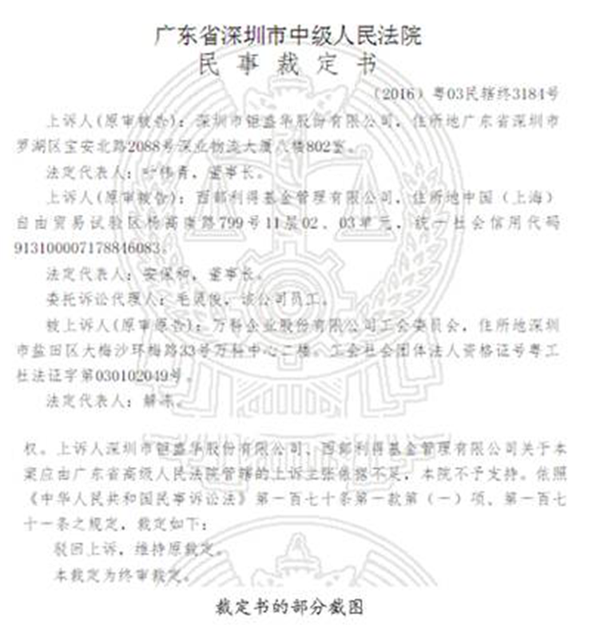 2016年9月,深圳中院做出驳回上诉,维持原裁定的终审裁定,确定了罗湖区法院的审理权。这一裁定于2016年11月公告,不知为何却在近日被媒体“翻炒”为实体判决,导致了假新闻事件的发生。至此,万科工会起诉钜盛华等损害股东利益纠纷案尚未审结,宝万之争仍无定论。