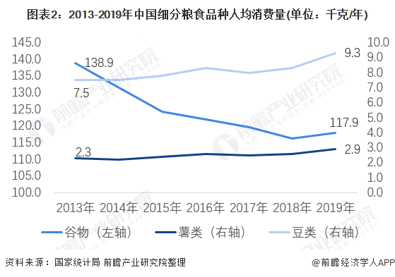 而从消费情况来看,三大类粮食作物人均消费变化情况呈现出较大差异,虽然谷物类粮食作物仍然是我国最主要消费的粮食作物,但人均消费量呈现下降趋势,反而豆类粮食作物则呈现上升趋势,薯类粮食作物则是呈现小幅波动增加。
