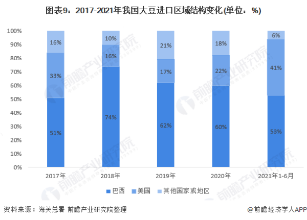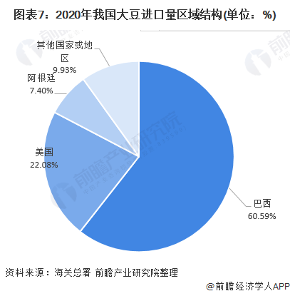 我国大豆进口量区域结构也可以看出我国大豆进口也主要源自巴西和美国以及阿根廷,其中从巴西进口的大豆数量占我国2020年全年进口数量的60.59%,从美国的进口数量占比也达到了22.08%。