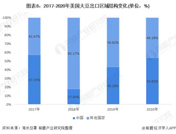 2018年,中美贸易摩擦爆发,美国对我国增加关税,作为第一轮的反制措施,我国对美国500亿美元商品也增加了关税,其中就包括大豆。这直接对美国大豆出口造成了巨大的影响,2017年,美国大豆近60%都出口到了中国,但到了2018年,这一比例大幅下降至20%以下,这两年随着贸易摩擦的有所缓和,美国向我国的大豆出口才有所回暖。