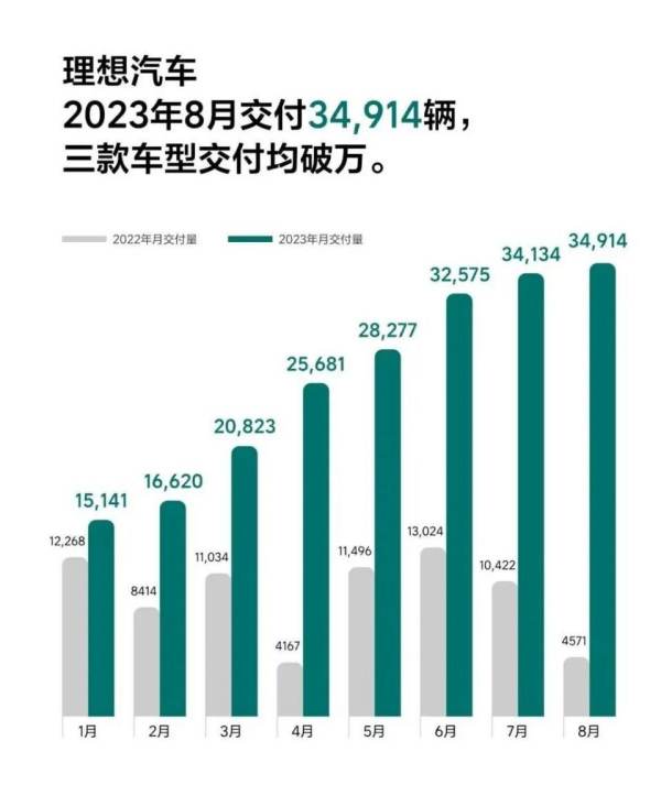 理想汽车8月共交付新车34,914辆,同比增长664%,环比增长2%,连续第三个月交付破3万,而且理想L系列的三款车型月交付均突破万辆。按照理想二季度财报给出的第三季度交付指引(10万~10.3万辆),理想9月销量将继续保持3万+的态势。