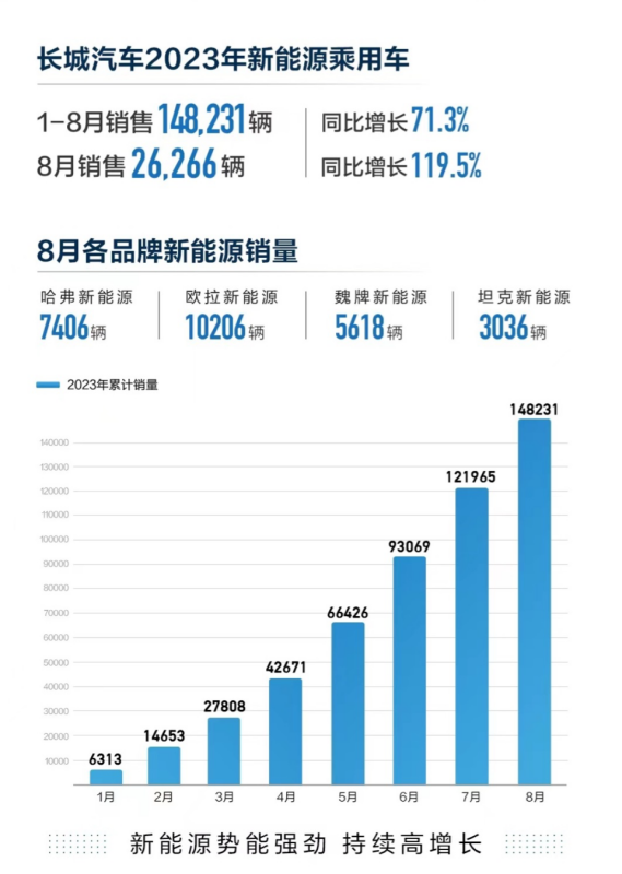 长城新能源8月销量26266辆,同比增长119.5%,其中哈弗品牌7406辆,欧拉10206辆,魏牌5616辆,坦克3036辆。今年1月~8月,长城新能源已累计销售148231辆,同比增长71.3%。