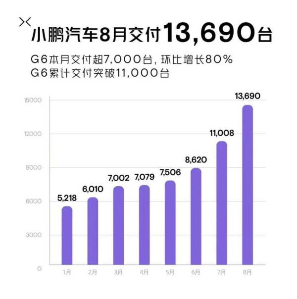 得益于G6的上市,小鹏汽车的交付量显著提升,连续两个月过万。8月小鹏汽车交付13690辆,环比增长 24%,同比增长 43%。其中G6 交付 7068 辆,环比增长 80%,占总交付量的比例过半。自7月中旬开启交付以来,G6累计交付已超1.1万辆。