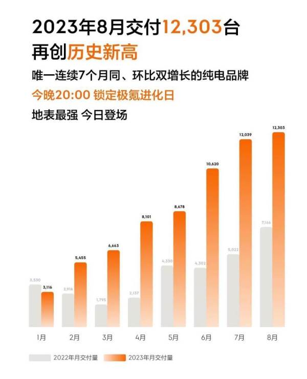 极氪001在8月推出的限时立减 3 万-3.7 万元,直接带动极氪8 月交付12303辆,同比增长 67.02%,环比增长 2.19%,创历史新高。官方表示,极氪是“唯一一个连续 7 个月同、环比双增长的纯电品牌”。