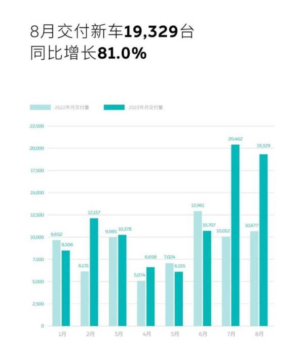 蔚来没能延续月销2万+,8月交付19329 辆,同比增长 81.0%,环比减少 5.54%。今年前8个月,蔚来共交付新车 94352 辆。根据蔚来财报给出的三季度 5.5万-5.7 万辆的交付指引,9 月的交付量在1.5万~1.7万辆之间,依然未能超过2万。