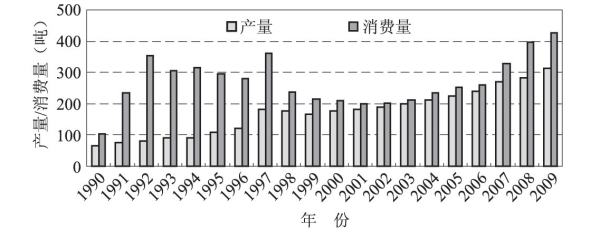 图2 1990~2009年我国黄金产量和消费量变化图资料来源:有色金属工业统计资料汇编(2000-2009年);中国黄金协会