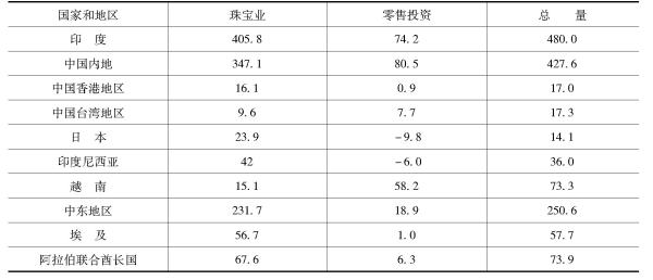 全球最大的黄金消费国是印度,2009年需求量为480.0吨,同比减少33%,其中珠宝业需求量405.8吨;其次是中国,需求量为427.6吨,同比增长9%,其中珠宝业需求量为372.8吨;美国第三,需求量为263.0吨,同比减少1%,其中珠宝业需求量为150.3吨(表6)。