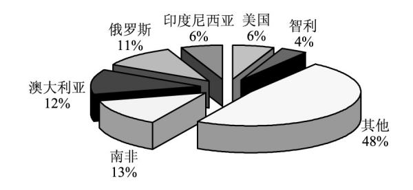 到2009年底,世界黄金储量为47000吨。世界黄金资源储量主要集中在南非、澳大利亚、俄罗斯、印度尼西亚、美国和智利,这六国储量合计占世界总量的一半以上。另外,黄金资源储量较多的国家还有中国、乌兹别克斯坦、加纳、墨西哥和秘鲁等(图1)。