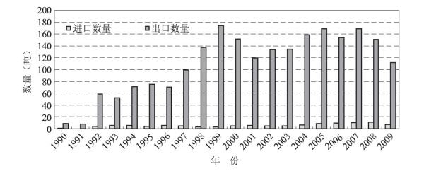 图3 1990~2009年黄金制首饰及其零件进出口量变化