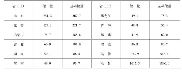 我国金矿以岩金为主,小型矿床多,开采技术条件复杂。截至2009年底,全国黄金矿区数为2517个,储量为1015.5吨。其中,岩金为713.9吨,沙金为103.6吨,伴生金为198.0吨。我国金矿查明资源储量6327.9吨,比上年增长9.3%,勘查新增540.2吨。按当前产量计算,我国目前金矿储量的静态保证年限为3.2年,处于较低水平。我国黄金资源主要分布在山东、江西、内蒙古、吉林、湖南、河南六省(区),合计占全国黄金总储量的61%(表1)。