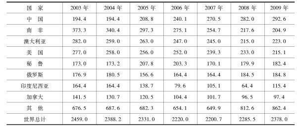表2 2003~2009年世界矿产金产量情况统计表单位:吨(金属量)