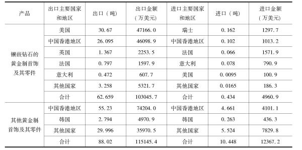 我国黄金出口产品主要是黄金首饰。2008年黄金制首饰及其零件贸易总额为23.53亿美元,出口金额为21.8亿美元,进口金额为1.73亿美元,分别比2007年增长了6.5%、5.3%和23.6%(表8)。