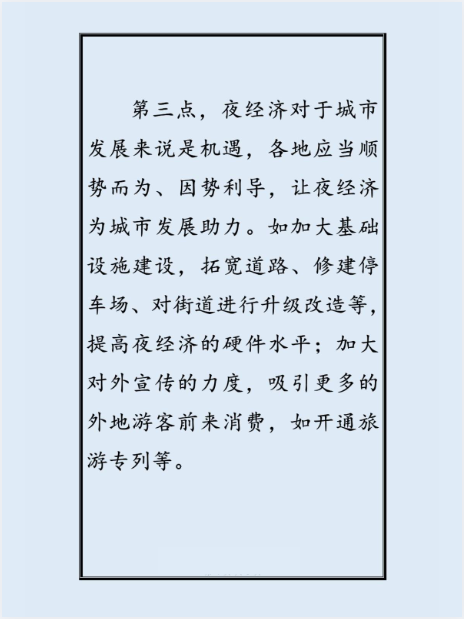 第三点,夜经济对于城市发展来说是机遇,各地应当顺势而为、因势利导,让夜经济为城市发展助力。如加大基础设施建设,拓宽道路、修建停车场、对街道进行升级改造等提高夜经济的硬件水平;加大对外宣传的力度,吸引更多的外地游客前来消费,如开通旅游专列等。