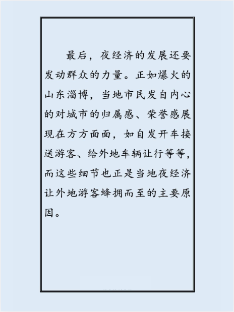 最后,夜经济的发展还要发动群众的力量。正如爆火的山东淄博,当地市民发自内心的对城市的归属感、荣誉感展现在方方面面,如自发开车接送游客、给外地车辆让行等等而这些细节也正是当地夜经济让外地游客蜂拥而至的主要原因。