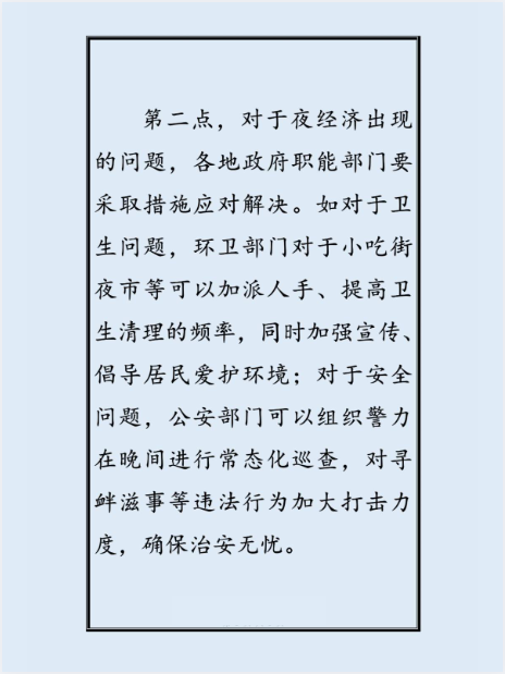 第二点,对于夜经济出现的问题,各地政府职能部门要采取措施应对解决。如对于卫生问题,环卫部门对于小吃街夜市等可以加派人手、提高卫生清理的频率,同时加强宣传倡导居民爱护环境;对于安全问题,公安部门可以组织警力在晚间进行常态化巡查,对寻衅滋事等违法行为加大打击力度,确保治安无忧。