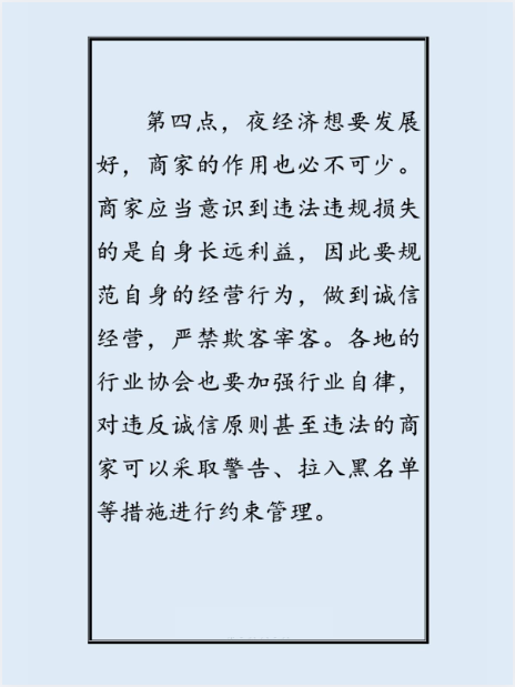 第四点,夜经济想要发展好,商家的作用也必不可少。商家应当意识到违法违规损失的是自身长远利益,因此要规范自身的经营行为,做到诚信经营,严禁欺客宰客。各地的行业协会也要加强行业自律对违反诚信原则甚至违法的商家可以采取警告、拉入黑名单等措施进行约束管理。