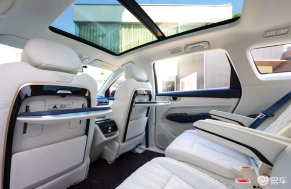 此外,车内二排座椅配备了 560mm 磁浮式滑轨、72° 的电动腿托并支持 180° 电动放平;第三排座椅支持 5/5 独立纯平放倒,大四座状态下最多可拥有 1514L 储物空间;第二排设有折叠桌板,搭配自动恒温空调、PM2.5 滤芯 + 负离子发生器。