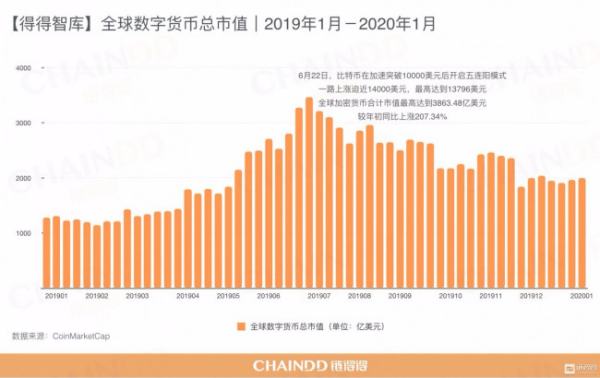 首先从2019年至2020年的加密数字货币市场的数据来总结,据得得智库数据显示,截止北京时间2019年12月31日24时,全球加密数字货币市场总市值为 1927.69 亿美元,2019年全年共计上涨53.35%。