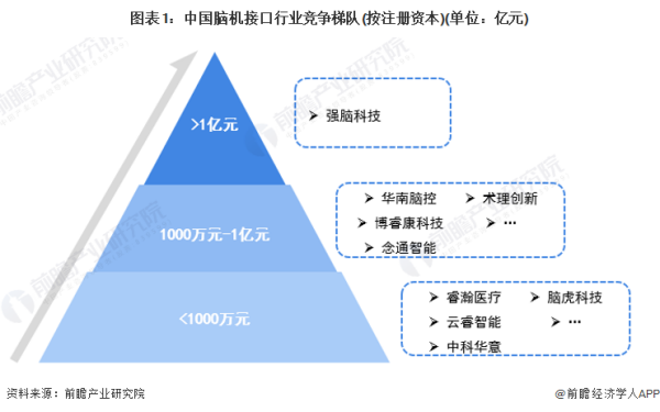 我国脑机接口行业正处于发展初期,行业内大部分企业规模较小。依据企业的注册资本划分,可以大概分为3个竞争梯队。其中,注册资本大于1亿元的仅强脑科技(Brainco)一家,注册资本在1000万以上的有华南脑控、念通智能、博睿康科技、术理创新等6家,其余企业注册资本均在1000万元以下。