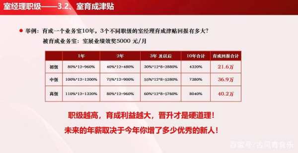 时代周报记者发现,如果育成一个业务室10年,初、中、高3个不同职级的室经理育成津贴回报分别为21.6万、36.9万和40.2万元。