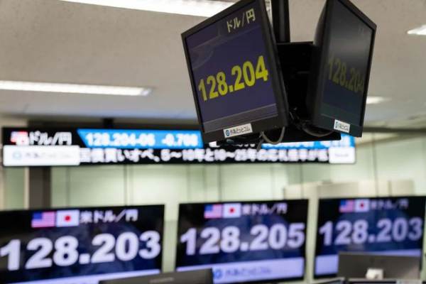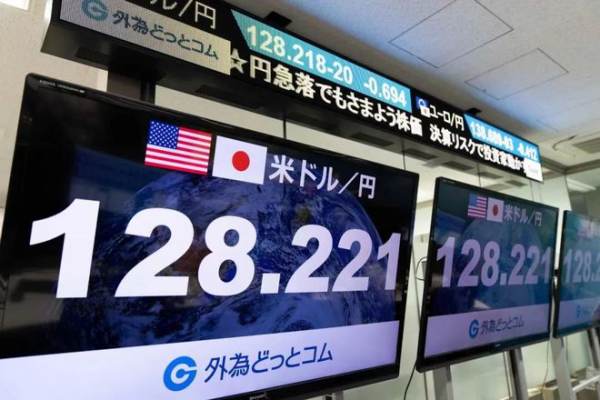 在日本东京,一家外汇经纪公司的大屏幕上显示着日元与美元的实时汇率情况。当天的日元兑美元汇率创20年来新低。日元对美元汇率一度跌破1美元兑换129日元关口,创下2002年5月以来新低。