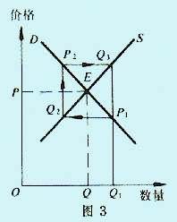 ③当供给弹性等于需求弹性时,波动将一直循环下去,即不会远离均衡点,也不会恢复均衡,如图3所示。供给弹性与需求弹性相等为“蛛网中立条件”,蛛网为“封闭型蛛网”。