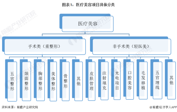 医疗美容科为一级诊疗科目,下设四个不同类别的二级诊疗科目,包括美容外科、美容牙科、美容皮肤科和美容中医科,其中美容外科中的项目可分为四个等级,四级高等项目只能在三级整形外科医院、设有医疗美容科或整形外科的三级综合医院开展。根据介入手段,医疗美容可分为手术类与非手术类。手术类项目从根本上改变或改善面部及身体部位的外观,包括眼部手术、鼻部手术、胸部整形和吸脂瘦身等;非手术类项目又称轻医美项目,包括注射项目与皮肤护理等。