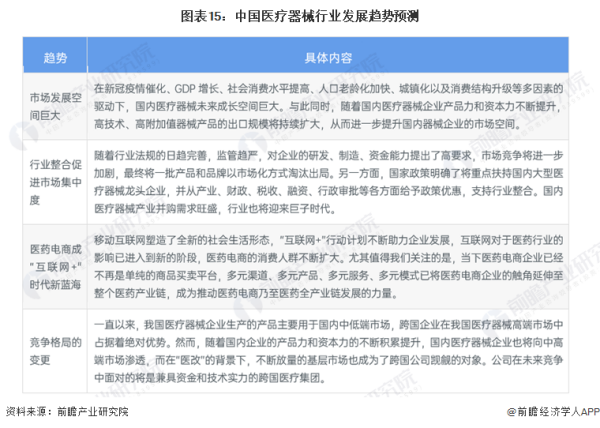 相比发达国家,我国医疗器械行业具有起步晚、规模小、产品单一的特点。但经过近几十年的快速发展,现我国医疗器械行业已成为一个产业门类比较齐全、创新能力不断增强、市场需求旺盛的朝阳产业。随着国家政策支持与优化、医改不断深入、人口老龄化不断凸显、消费能力和健康意识提升,促使我国医疗器械行业尤其是国内医疗器械龙头企业进入了黄金发展时期。而国内高歌猛进的医疗器械市场,在兼具资金和技术优势的国际医疗巨头的青昧下,行业竞争激烈,机会与挑战并存,未来中国医疗器械或有以下发展趋势: