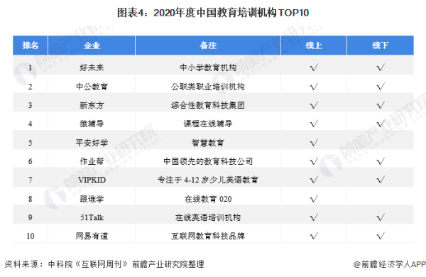 在市场竞争方面,线上教育品牌“你追我赶”,传统线下培训机构转型升级、加速布局线上业务,据中科院《互联网周刊》公布的榜单显示,2020年排名前三的中国教育培训机构分别是好未来(前身是学而思)、中公教育和新东方。