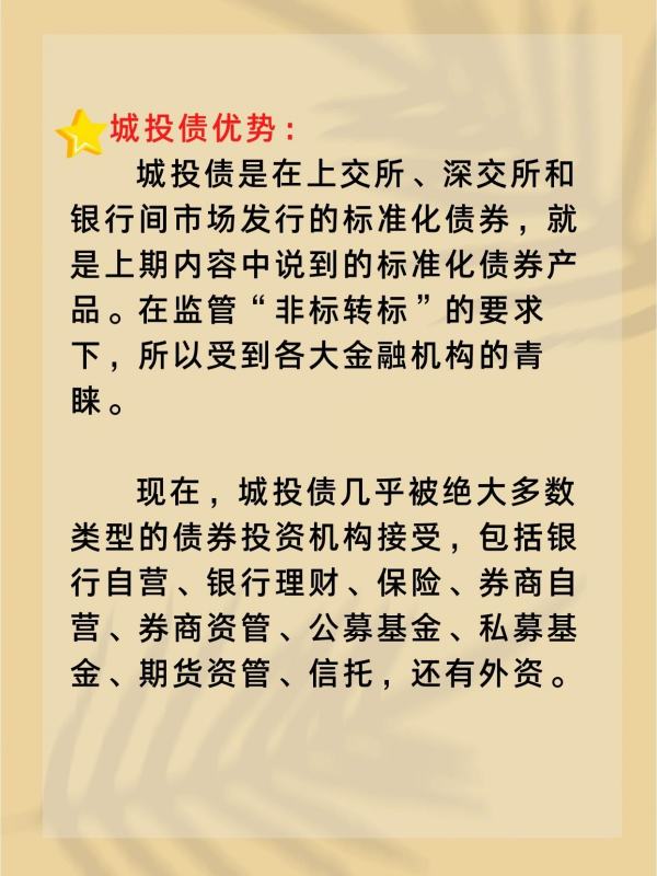 城投债是在上交所、深交所和银行间市场发行的标准化债券,就是上期内容中说到的标准化债券产品。在监管“非标转标”的要求下,所以受到各大金融机构的青睐。