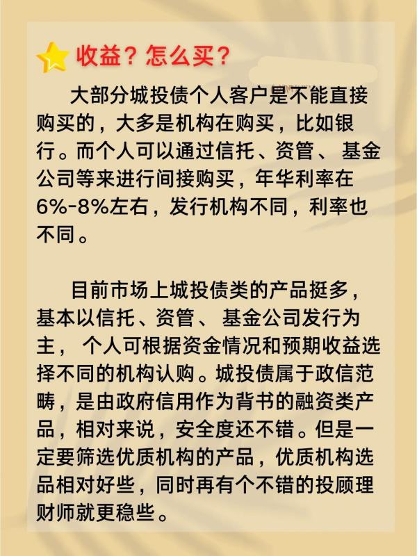 大部分城投债个人客户是不能直接购买的,大多是机构在购买,比如银行。而个人可以通过信托、资管、 基金公司等来进行间接购买,年华利率在6%-8%左右,发行机构不同,利率也不同。