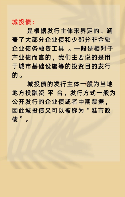 是根据发行主体来界定的,涵盖了大部分企业债和少部分非金融企业债务融资工具 。一般是相对于产业债而言的,我们主要说的是用于城市基础设施等的投资目的发行的。懂理