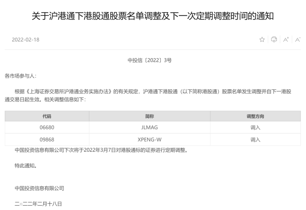 易车讯 2月18日,小鹏汽车获纳入沪港通下港股通股票名单,并自下一港股通交易日起生效。