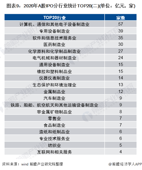wind数据显示,2020年,按照证监会的行业分类标准,A股IPO前三大热门行业分别为:①计算机、通信和其他电子设备制造业,融资金额达到1030.08亿元,企业数量达到57家;