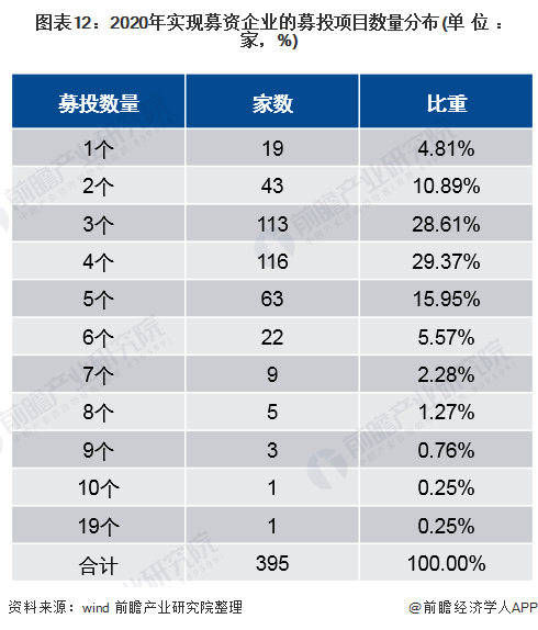 wind数据显示,2020年,共有395家企业实现募资,企业募投项目数量合计达到1514个,募投项目发生变更的比例为9.71%,计划投入募集资金占计划总投资额的87.86%。大部分企业的募投项目数量位于2-5个的区间,比重合计达到84.81%;金龙鱼的募投项目数量最多,达到19个。