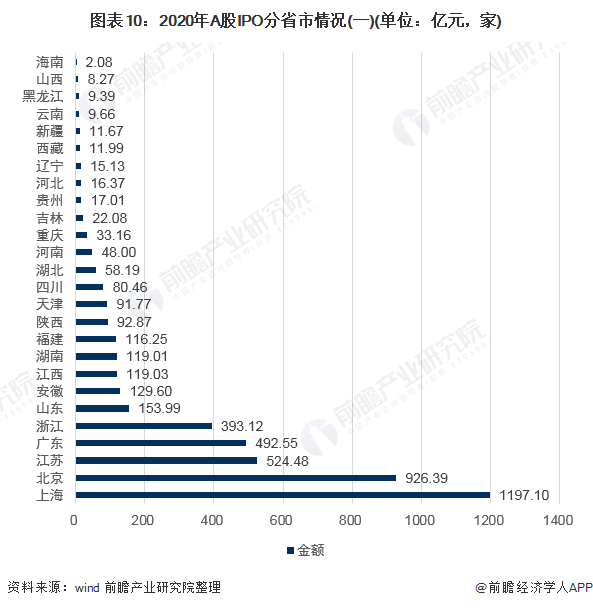 wind数据显示,2020年,从融资金额来看,上海市企业IPO融资金额最高,达到1197.10亿元,其次为北京市,融资金额达到926.39亿元,IPO大省还有江苏省、广东省和浙江省,上述五个省市常年占据IPO排行榜前五名;