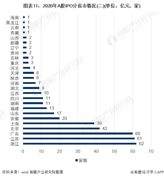 从企业数量来看,浙江省IPO家数达到62家,其次为江苏省,达到61家。此外,安徽、江西、湖南三地较去年融资额度增长较快,跃进排行榜前十。