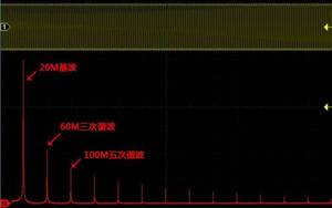 由此图可知,20M示波器基本无法观察到方波形状,另外100M示波器的观察效果比60M示波器要好,是什么导致了这个原因呢?下图是一个20M方波经过FFT后的频谱图,我们可以看到方波是由基波以及3、5、7、9……次谐波分量递加而成。所以20M的方波包含20M基波、60M三次谐波,100M五次谐波,140M七次谐波……
