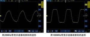 带宽作为示波器的首要参数指标,带宽不足时波形就会严重失真,方波甚至可能会变成正弦波,我们用分别20M带宽和100M带宽的示波器来观察20M的方波信号,得出结果入下图: