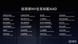 作为开创城市探索SUV新品类的车型,自游家NV支持用户在城市与户外自由探索,该车全系标配24项AAD(Advanced Assistant Driving 高阶辅助驾驶系统)功能,包括AEB(自动紧急制动)、ACC(全速域自适应巡航)、LCC(车道居中控制)、LCA(变道辅助)、BSD(盲区监测)、APA(全自动泊车)等功能。