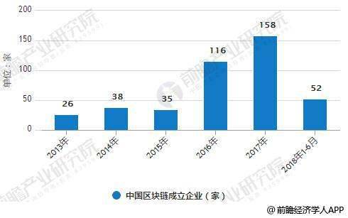 2013年及之前,我国注册成立的区块链相关企业只有26家。2016年,注册成立的区块链企业有116家,2017年注册成立158家,2018年1月至6月底,注册成立52家。