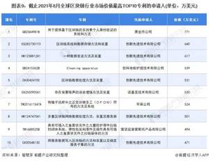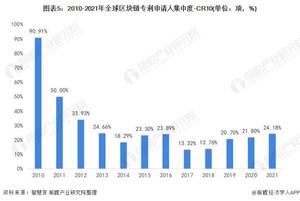 2010-2021年8月,全球区块链专利申请人CR10呈现波动下降趋势,由2010年的90.91%波动下降至2021年8月的24.18%。整体来看,全球区块链专利申请人集中度较高,但集中度呈现下降趋势。