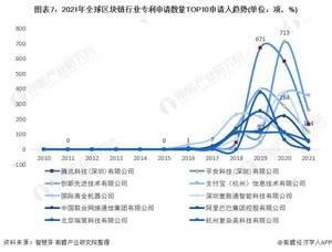 全球区块链行业专利申请数量TOP10申请人分别为腾讯科技(深圳)有限公司、平安科技(深圳)有限公司、创新先进技术有限公司、支付宝(杭州)信息技术有限公司、国际商业机器公司、深圳壹账通智能科技有限公司、中国联合网络通信集团有限公司、阿里巴巴集团控股有限公司、北京瑞策科技有限公司、杭州复杂美科技有限公司。