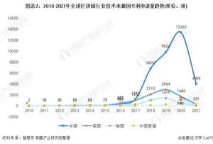 从趋势上看,2010-2016年,各国区块链专利申请数量相差不大,美国暂时领先,但是在2017年后中国实现反超。2020年,中国区块链专利申请量为1.34万项,而美国区块链专利申请量仅1686项。