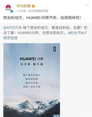3月8日,华为与赛力斯联手打造的AITO汽车在官方微博和微信公众号平台发布“妇女节宣传海报”,令人惊诧的是,没有使用AITO问界”,而是用了全新的“HUAWEI问界”这一新说法。紧接着,华为终端官方微博账号也转发了这条微博,并配文表示:“想去的地方,HUAWEI问界汽车,始终陪伴你!”