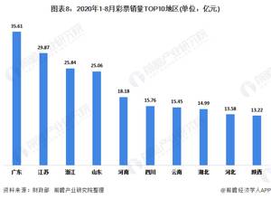 广东省是目前全国彩票销量最高的省份,2020年1-8月,广东省彩票总销量为35.61亿元,同比增长8.7%。销量排在第二和第三位的是江苏省和浙江省。