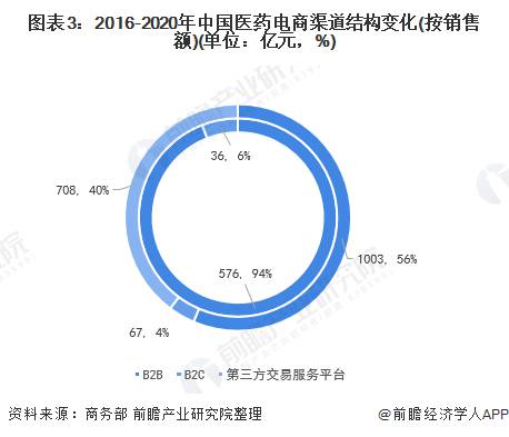 随着电商平台发展与医药改革,医药购买渠道逐渐放开,医药电商B2C渠道呈增长趋势,而新冠肺炎疫情的暴发改变了人们问诊、购药习惯,更加速了B2C、第三方平台渠道的发展。根据商务部数据,2020年中国医药电商B2C渠道销售额占比明显下降,由原先的94%降至56%,渠道份额被B2C与第三方交易服务平台占领,其中B2C渠道销售占比由6%大幅提升至40%