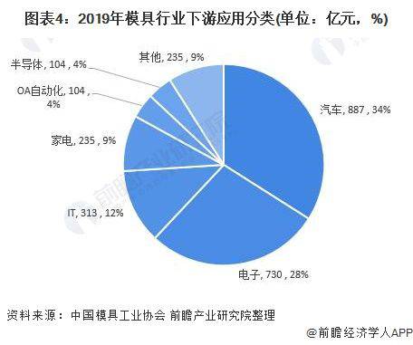 按照模具应用市场来分类的话,我国用于汽车领域、电子领域和IT领域的模具占据了模具消费前三。2019年汽车模具销售收入占比34%,约为887亿元;电子模具销售收入占比28%,约为730亿元;IT模具销售收入占比12%,约为313亿元;家电模具销售收入占比9%,约为235亿元;OA自动化模具销售收入占比4%,约为104亿元;半导体模具销售收入占比4%,约为104亿元;其他模具销售收入占比9%,约为235亿元。