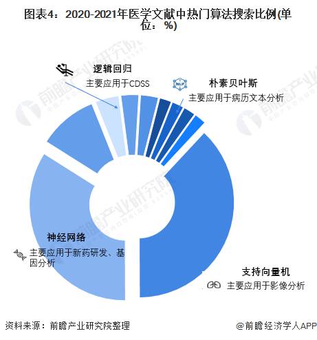 2012-2020年在医学文献中使用到的热门机器学习算法和深度学习算法包括:支持向量机(38%),主要应用于识别成像生物标志物和医疗影像分析;神经网络(34%),主要应用于生化分析、图像分析和药物开发;逻辑回归(4%),主要用于疾病风险评估和CDSS。AI医疗整体底层技术较为成熟,应用端准备充分